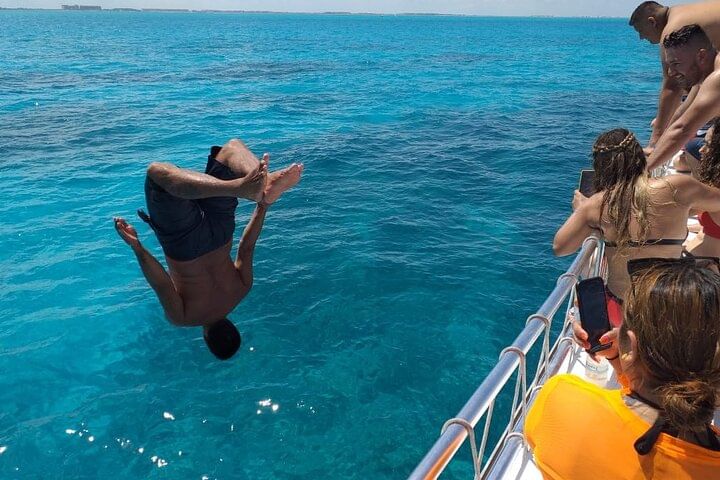 Enjoy and get to know Islas Mujeres! Aboard our Catamaran together we will navigate the clear and calm waters of the Caribbean Sea. During our journey to Islas Mujeres, we will enjoy an unforgettable navigation. We will do several activities during the tour, snorkeling to see the statues under the sea and reef, relaxing at the beach club, open bar, free time on north beach, party and contests on board. Always surrounded by a tropical environment.